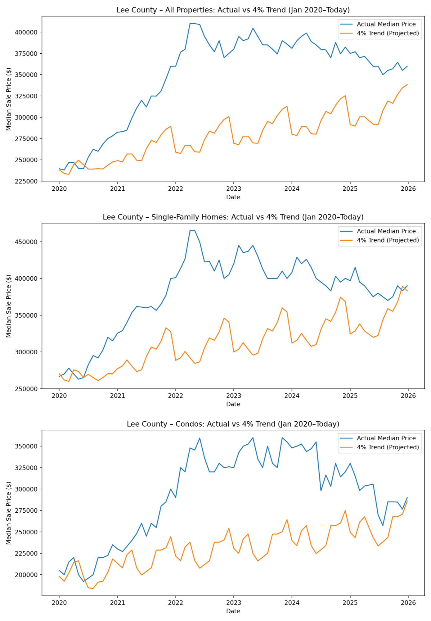The charts below compare the actual median sale prices from Lee County sales history to an average 4% appreciation trendline.